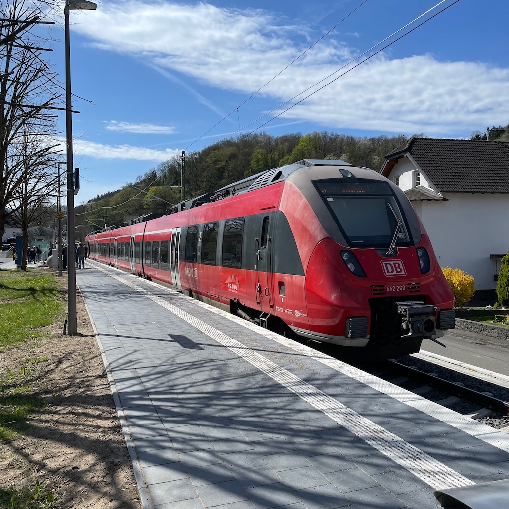 Ab mittags beausflugte ich mit Leuten des Kölner Eisenbahnfreundevereins die Ahrtalbahn, die nach der Flutkatastrophe im Sommer 2021 seit vergangenem Dezember wieder durchgängig und nunmehr elektrisch befahren wird, ich berichtete. Zunächst fuhren wir bis zum Endpunkt in Ahrbrück, dann gleich wieder zurück bis Altenahr. Ab dort bewanderten wir sonnenbeschienen ein Stück des Rotweinwanderwegs, vorbei an noch blattlosen Reben und ohne Rotwein. Wobei das Wort Wanderung übertrieben wäre, Ziel war das nur etwa fünf Kilometer entfernte Mayschoß. Dort kehrten wir ein in die Bahnhofsgaststätte, und weil sich ein Ahrtalbesuch ohne Weinverzehr unvollständig anfühlt, wurden mehrere Flaschen Blanc de Noir geordert und geleert. Danach brachte uns, weiterhin im Vollbesitz der geistigen und körperlichen Kräfte, die Ahrtalbahn zurück nach Bonn, wo beim Abschied Einigkeit darüber herrschte, einen schönen Nachmittag miteinander verbracht zu haben.