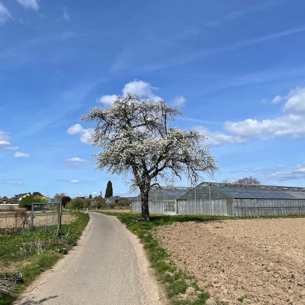 Montag: Auch heute blieben wir lange im Bett und frühstückten spät, warum auch nicht. Um die Ostertage nicht nur essend, trinkend und schlafend zu verbringen, unternahmen der Liebste und ich nachmittags eine Radtour nach Brühl. Das Wetter zeigte sich anfänglich jackenkühl mit Sonnenschein, somit bestens für eine Radtour. Und also fuhren wir durch Felder und recht idyllische Orte wie Bornheim-Sechtem, das ich bislang nur vom Vorbeifahren mit der Bahn kannte. Die Rapsblüte schreitet voran, für mich immer wieder ein Grund, anzuhalten und zu fotografieren, obwohl es doch jedes Jahr gleich aussieht, wäre ja auch seltsam, wenn er plötzlich, sagen wir blau blühen würde. Die Bonner Kirschblüte ist ja auch immer gleich, dennoch strömen sie jedes Jahr in Scharen durch die Innere Nordstadt, die wir heute bewusst mieden, die Menschenmassen nahmen wir nur im Vorbeifahren aus den Augenwinkeln wahr. Zurück in die Bornheimer Felder: Auch der Flieder steht kurz vor der Blüte, nur die Kastanien brauchen noch etwas, bis sie sich mit ihren prächtigen weißen und roten Dolden schmücken. Für mich ist diese Phase der möglichst gleichzeitigen Raps-, Flieder und Kastanienblüte stets die schönste Zeit des Jahres, vermutlich schrieb ich es schon mehrfach, sehen Sie es mir bitte nach. Erstaunt war ich, dass der Rhabarber schon geerntet wird, auf dass die Produktion von Rhabarberkuchen, -schorle und -likör nichts ins Stocken gerät.