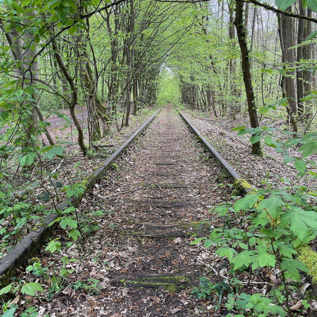 Zur Wanderstrecke: Die erste Hälfte führt überwiegend durch Wald, allerdings zum größeren Teil auf breiten, über längere Strecken geraden Wegen. Hinter Lohmar in der Wahner Heide wird es etwas wilder und abwechslungsreicher. Kurz vor Siegburg traf ich überraschend auf ein zugewachsenes Bahngleis, einst die Bahnstrecke von Siegburg nach Lohmar, die bereits 1989 stillgelegt wurde. Umso erstaunlicher, dass das Gleis immer noch liegt. Ab hier wich ich von der vorgesehenen Route ab und folgte dem Weg neben dem Gleis bis zu seinem Ende kurz vor Siegburg, ab da führt der Weg auf der ehemaligen Bahntrasse bis in die Siegburger Innenstadt.