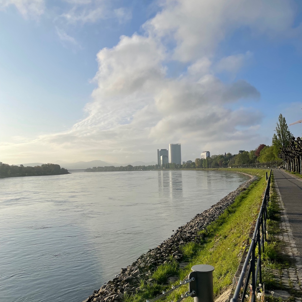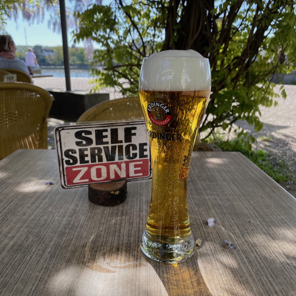 Nachmittags flanierte ich durch Bonn-Beuel auf der anderen Rheinseite. Das Wetter kann sich noch nicht entscheiden zwischen warm und kühl, optisch ist es wärmer als empfunden. Jedenfalls von mir, der sich in leichter Daunenjacke immer noch ganz wohl fühlt, während andere in kurzen Hosen und T-Shirts schon weiter sind. Als Etappe war der Bayrische Biergarten am Beueler Ufer vorgesehen. Dort war zwar noch Platz, allerdings auch eine lange Warteschlange vor der Getränkeausgabe. Da mir die Gefahr zu groß erschien, dass die letzten freien Plätze belegt seien von den vor mir gewartet habenden, wenn ich endlich an der Reihe bin, und ich dann da stehe mit meinem Bier, mich irgendwo dazusetzen, womöglich gar mit Fremden sprechen müsste, ging ich ein Lokal weiter, wo es zwar keinen Maibock gab, dafür genug freie Plätze. Und ein Weißbier schmeckt auch mal ganz gut.