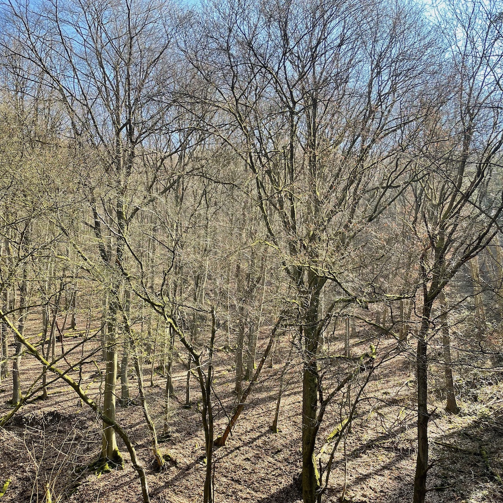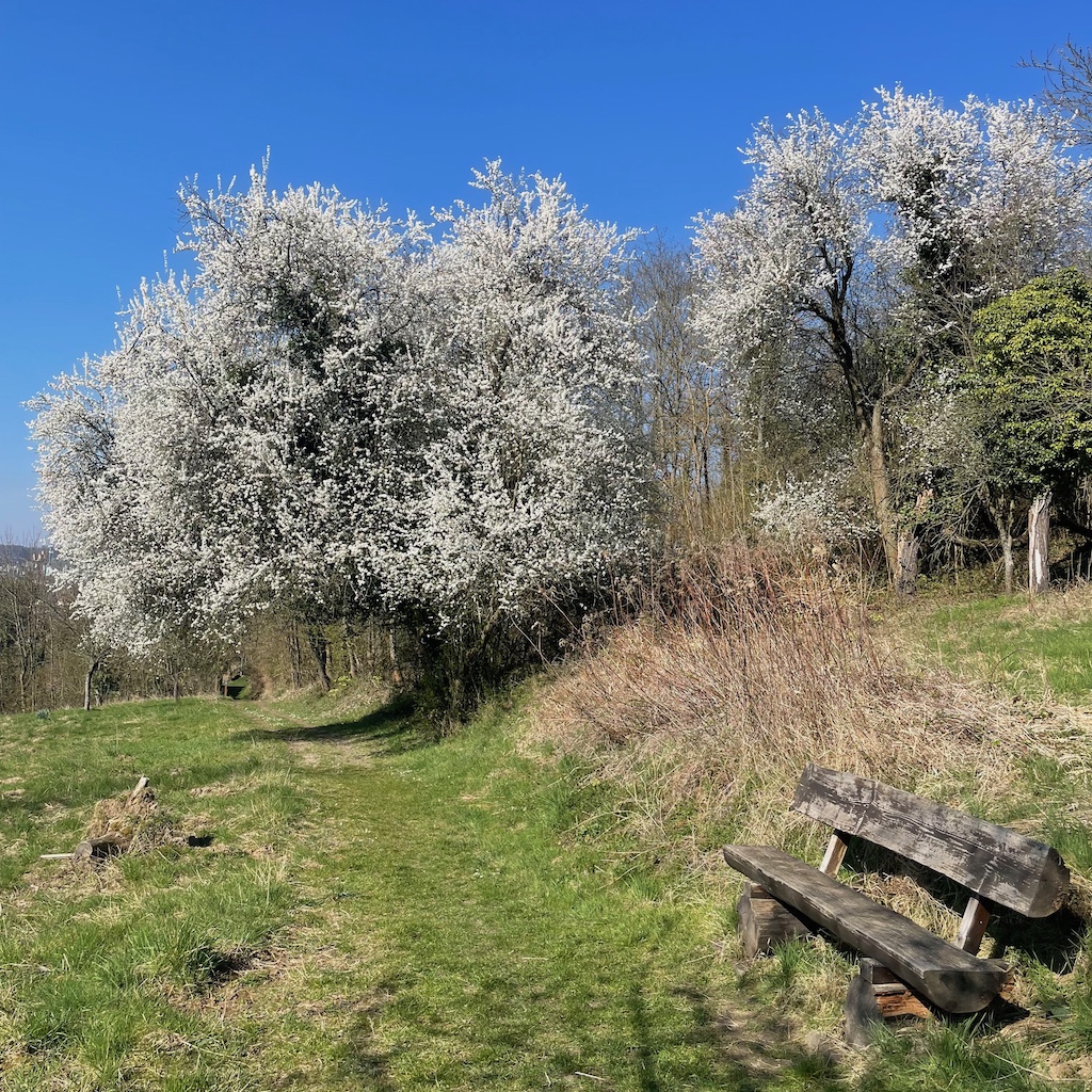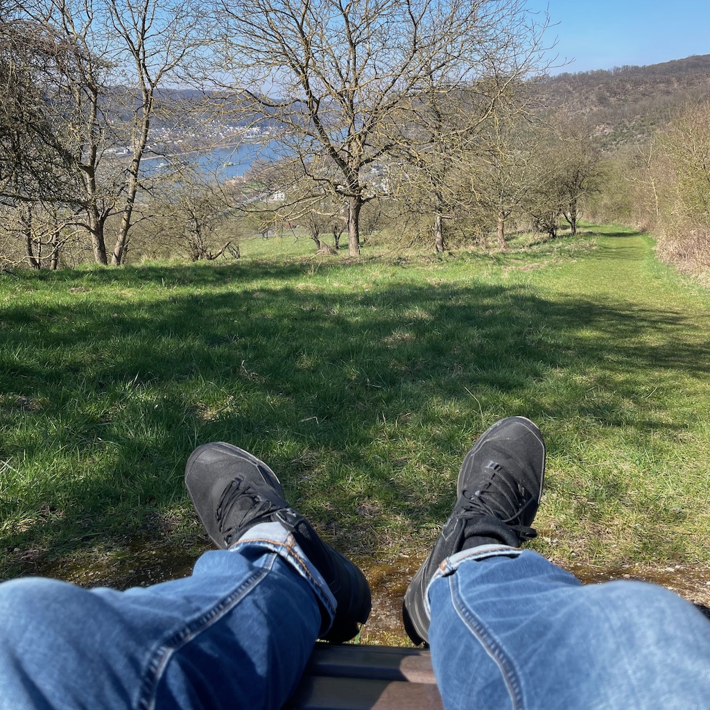 Unterwegs sah ich den ersten Schmetterling des Jahres, ein Tagpfauenauge, später mehrere Zitronenfalter, Kohlweißlinge und Kleine Füchse, zudem zwei Eidechsen. Hinter dem Ort Hammerstein ging es, stets bergauf, in den Wald, wo erstmals und vorübergehend das permanente Rheintalrauschen von jeweils zwei Bundesstraßen und stark befahrenen Bahnstrecken verstummte.